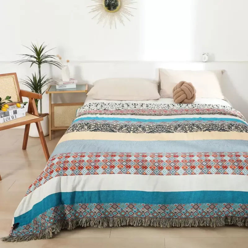Striped Cotton Towel Blanket with Tassels – Sofa Cover & Bedspread